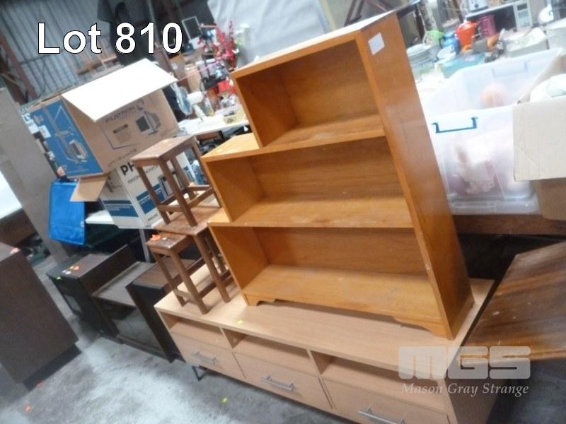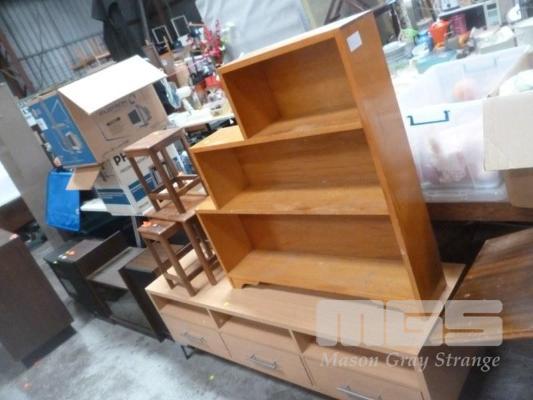 TIMBER VENEER LOWLINE ENTERTAINMENT UNIT, TIMBER BOOKCASE & NEST OF 3 TABLES