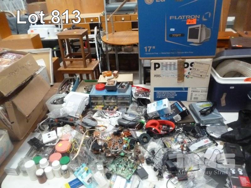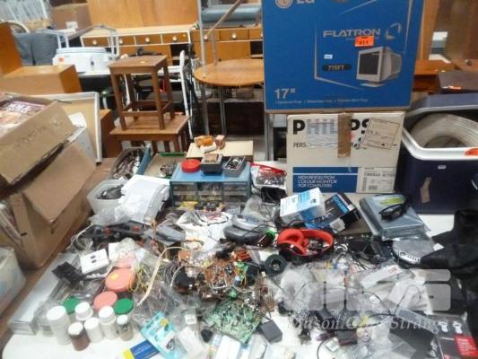 2 x CRT MONITORS, ASSORTED ELECTRONIC COMPONENTS, FITTINGS, ETC, 1 x TABLE