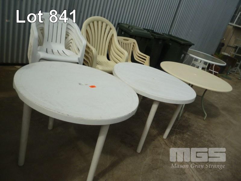 3 x PLASTIC OUTDOOR TABLES WITH STACKABLE OUTDOOR CHAIRS