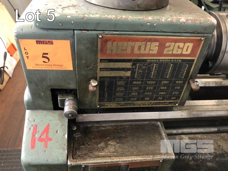 HERCUS CENTRE LATHE, 260. MOD: ATM S/NO: 17859 5", 3 JAW CHUCK 6", 4 JAW CHUCK 8" FACE PLATE DRIVE PLATE & DOG 3 POINT STEADY DRILL CHUCK, JACOBS 1/2" LIVE CENTRE 4 WAY TOOL POST & SINGLE TOOL POST ON ORIGINAL STAND CHUCK GUARD WITH SAFETY SWITCH 415V WITH E/STOP