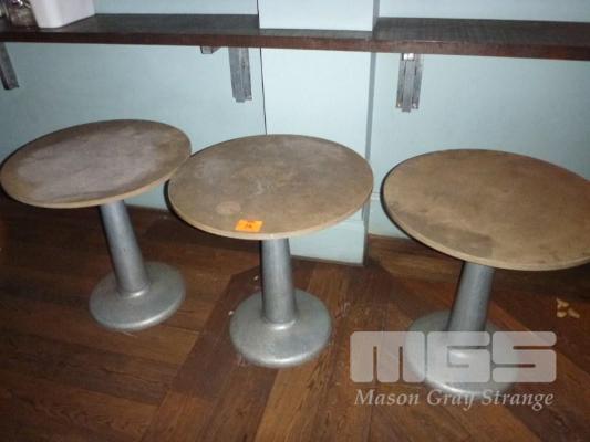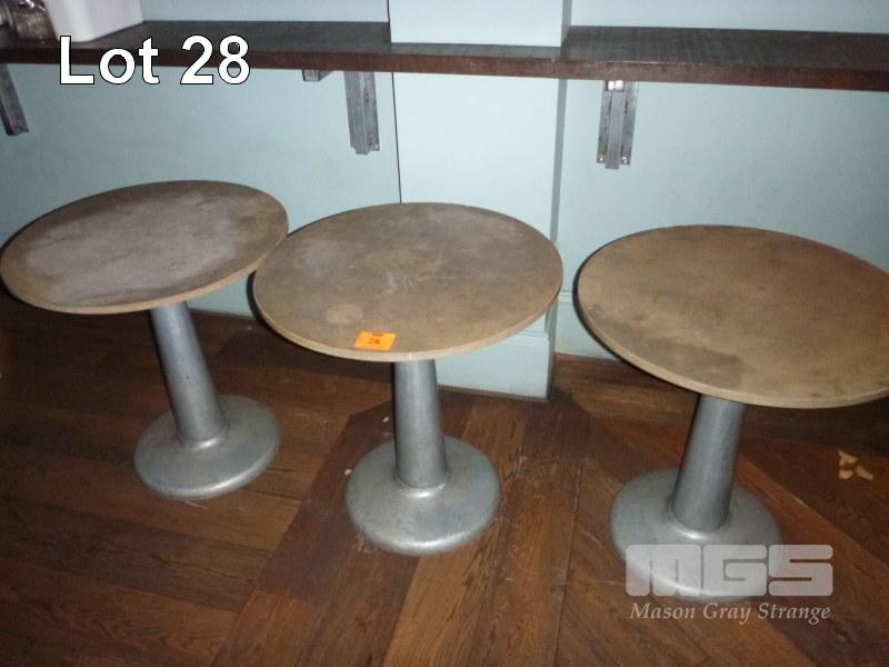 3 x CAFE TABLES, 70cm DIAMETER, MOULDED TOP, STEEL PEDESTAL BASE