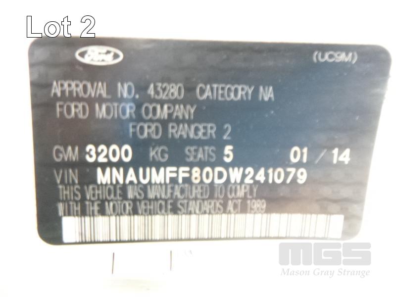 2013 FORD RANGER HI RIDER PX DUAL CAB UTILITY REG: S251 BAN (SA) VIN: MNAUMFF80DW241079 ENG: P4AT1156988 ODO: 231,034kms SHOWING 2.2 LITRE, 4 CYLINDER, 6 SPEED AUTOMATIC TRANSMISSION, DIESEL, WHITE DUCO, 4 DOORS, 5 SEAT, RWD ABS, AIR BAG, AIR CON, BLUETOOTH, CD PLAYER, CENTRAL LOCKING, CRUISE CONTROL, POWER STEERING, POWER WINDOWS, TOW BAR, KEY #19 (WITH 2 KEY/S, WITH OWNER'S MANUAL, WITH SERVICE BOOKS) CONDITION: - MINOR SCRATCHES