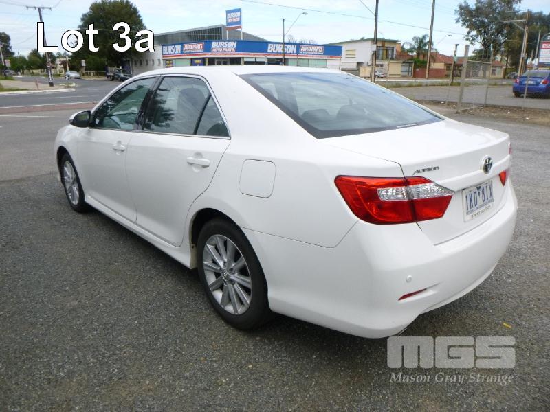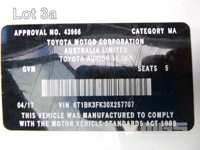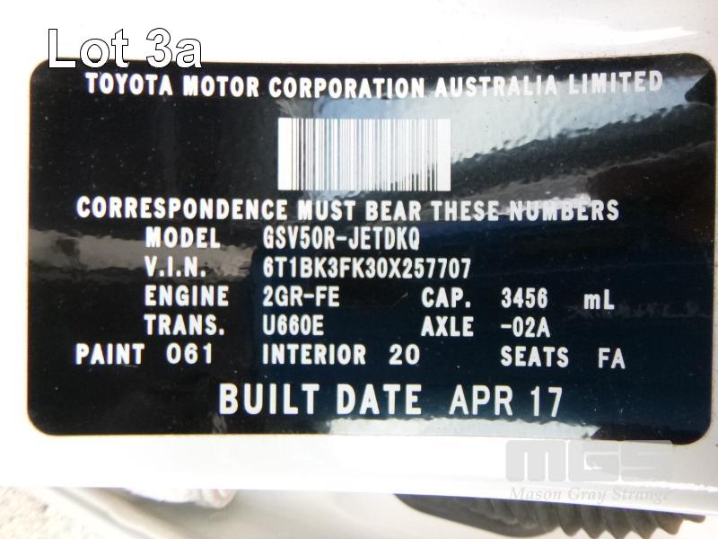 2017 TOYOTA AURION AT-X GSV50R-JETDK0 50 SERIES SEDAN REG: 1KD 8IX (VIC) VIN: 6T1BK3FK30X257707 ENG: 2GRK380185 ODO: 38,560kms SHOWING 3.5 LITRE, V6, AUTOMATIC TRANSMISSION, PETROL, WHITE DUCO, 4 DOORS, 5 SEAT, FWD ABS, AIR BAG, AIR CON, ALLOY WHEELS, BLUETOOTH, CD PLAYER, CENTRAL LOCKING, CRUISE CONTROL, IMMOBILISER, POWER STEERING, POWER WINDOWS, SAT NAV, SPARE WHEEL, TRACTION CONTROL, KEY #13 (WITH 1 KEY/S, WITH OWNER'S MANUAL, WITH SERVICE BOOKS)