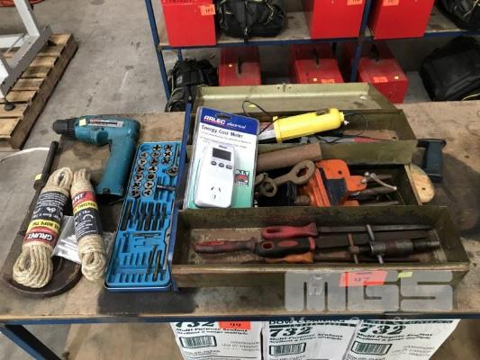 TOOL BOX & CONTENTS, PART TAP & DIE SET, DRILLS, CLAMP, VICE, ETC