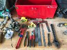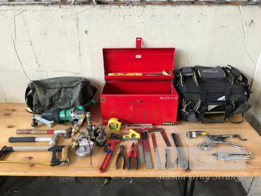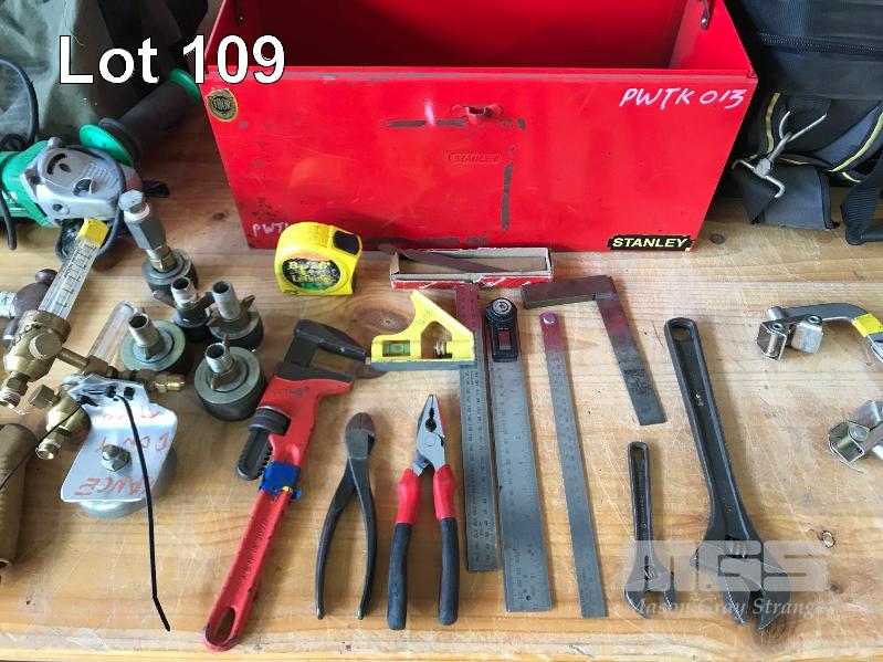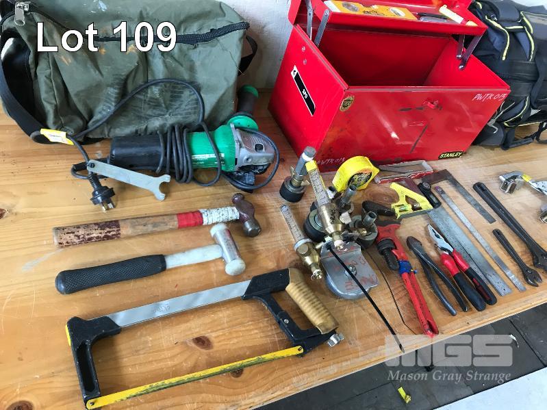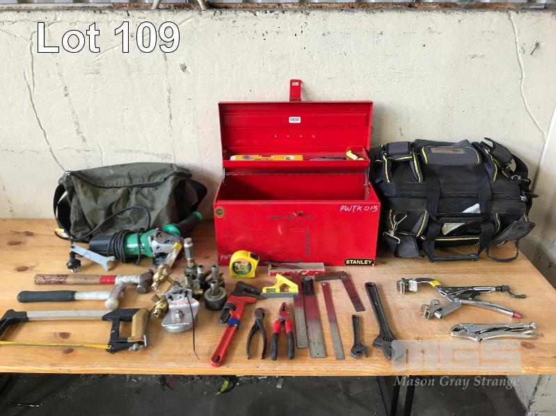 TOOLBOX AND CONTENTS INCLUDING STANLEY HEAVY DUTY SINGLE LID TOOL BOX, STANLEY FAT MAX HARD BASE TOOL BAG, ORANA CANVAS TOOLBAG, HITACHI ANGLE GRINDER 125mm G13SE2, 2 X GAS FLOW METERS ON POT MAGNET MOUNTED ASSEMBLY, 5 X ASSORTED PIPE PRESSURE TEST PLUGS, STANLEY KNIFE, SIDCHROME CENTER PUNCH, STANLEY FOLDING LINE OF CHORD STEEL RULE, TOOLMASTER DIGITAL ANGLE RULE * CONDITION UNKNOWN *, STARRETT TAPER GAUGE, STABILA SPIRIT LEVEL (W/MAGNETIC BASE) * AF *, LUFKIN STEEL TAPE MEASURE, TORCH * CONDITION UNKNOWN *, RIDGID STRAIGHT SPUD WRENCH, FISHER ENGINEERS SQUARE,STANLEY ADJUSTABLE COMBINATION SQUARE, 2 X SIDCHROME ADJUSTABLE WRENCHES, PIPE PLIERS, SIDCHROME COMBINATION PLIERS, SIDE CUTTERS, STRAIGHT JAW VISE-GRIPS, STANLEY BOX HACKSAW, THOR NYLON HAMMER, TROJEN BALL PEIN HAMMER, EBONY BRASS PADLOCK ETC.