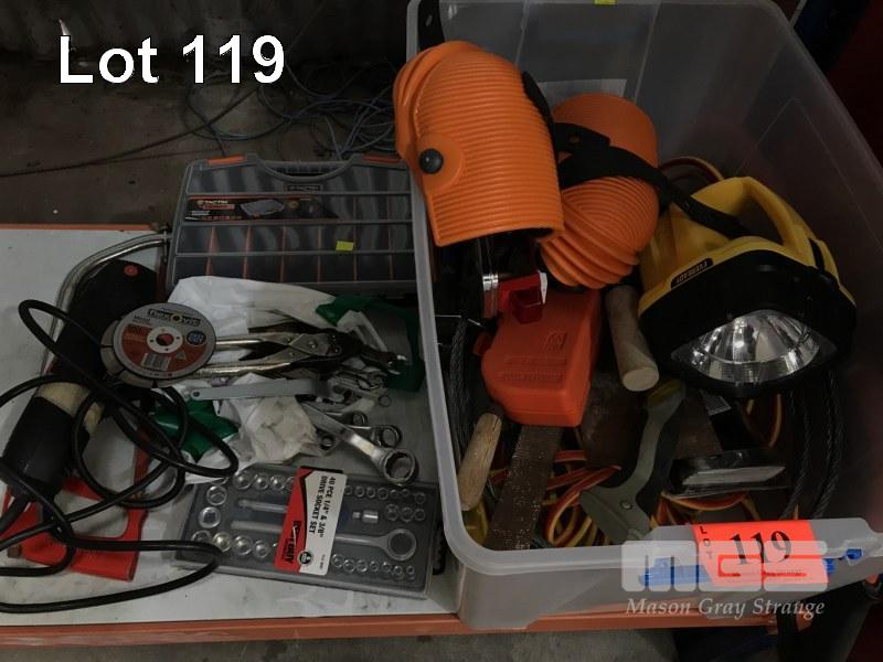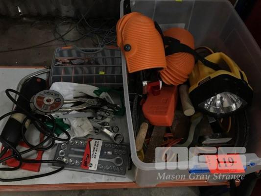 ASSORTED HAND TOOLS, SOCKET SETS, TORCH, SKIL ANGLE GRINDER, EXTENSION LEAD, 1 x TUB