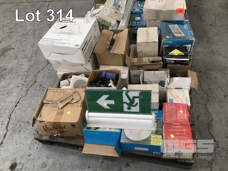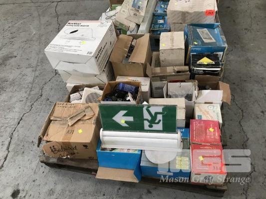 ASSORTED LIGHTING, CEILING FAN COVERS, EXIT LIGHT, DOWN LIGHTS, SHOP LIGHTS, FLOOD LIGHTS, HALIDE, LED, ETC, 1 x PALLET