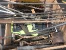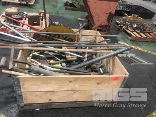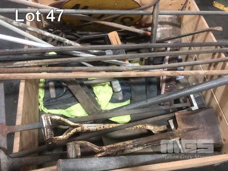 ASSORTED LANDSCAPING TOOLS INCLUDING SHOVELS, CROW BARS, JIMMY BARS, LOLLY POP SIGNS, BROOMS, SCREED, ETC
