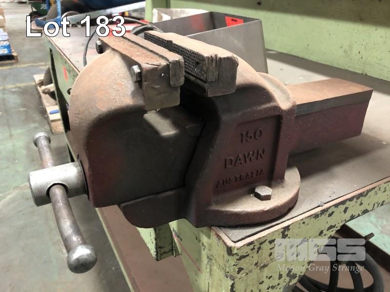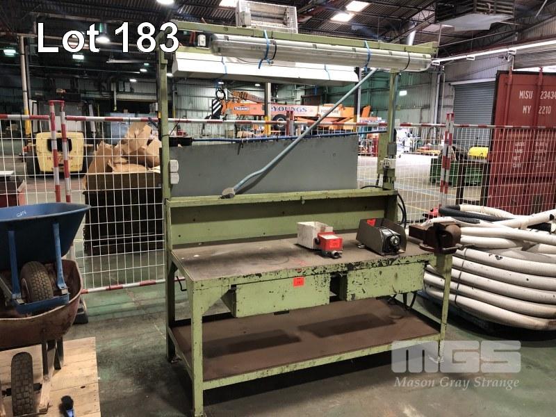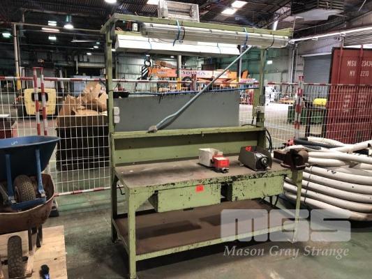 H/ DUTY WORKSHOP BENCH WITH 6" DAWN VICE, 2 x DRAWER, OVERHEAD LIGHTING, PARTS SHELF, GPO's, FITTED WITH AIR LINES & OILER, WATER TRAP 1800 x 800mm