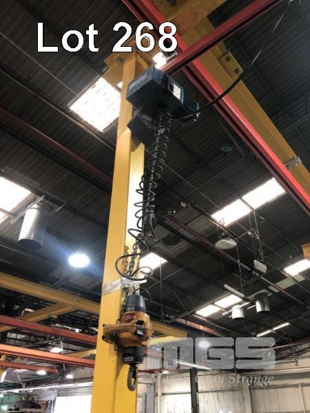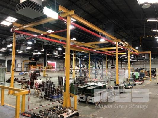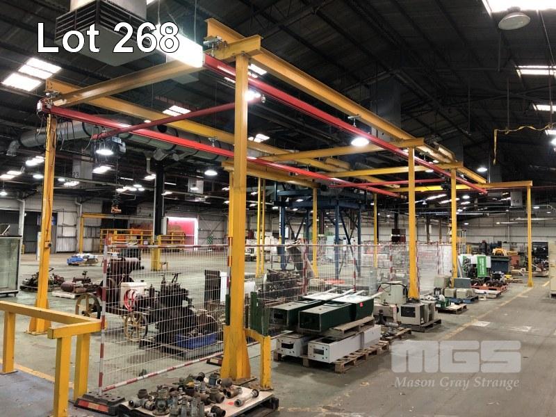 FREESTANDING OVERHEAD LIGHT CRANE SYSTEM WITH 250kg ELECTRIC HOIST & 125kg HOIST DEMAG HOIST CHAIN TYPE APPROX 20m TRAVEL 4m CROSS TRAVEL APPROX 8 x COLUMNS APPROX 3.9m (H) (COMPLETELY DEMOUNTABLE, NOT WELDED) (BUYER TO REMOVE) (OHS STRICTLY APPLIES)