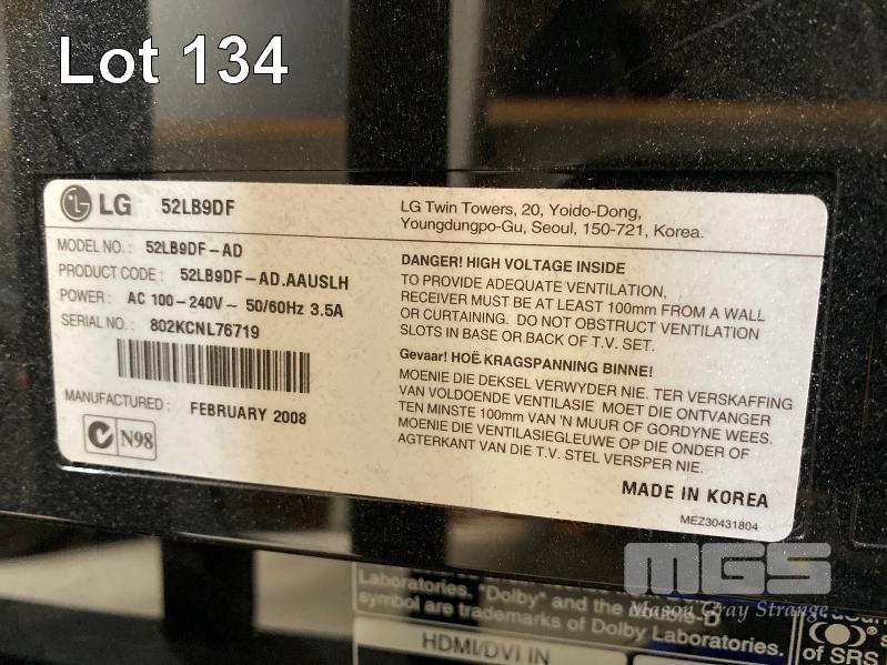 TV, LG 52LB9DF 52" LCD WITH WALL MOUNT BRACKET (NO REMOTE, NO STAND) S/N:802KCNL76719