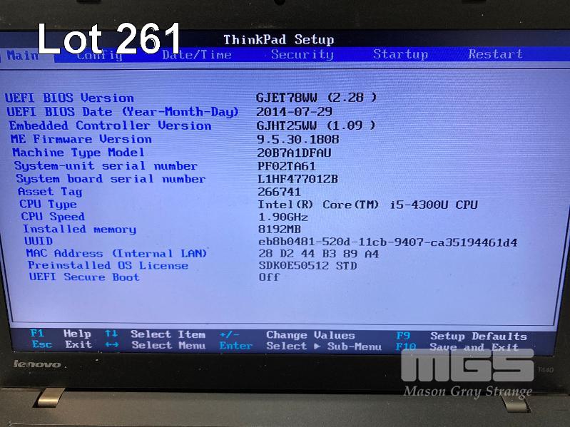 LAPTOP / ULTRABOOK, LENOVO THINKPAD T440 (20B7A1DFAU), CORE i5 4300U (4TH GEN) @ 1.9GHz, 8GB DDR3 RAM, 480GB SSD, 14" WIDESCREEN (1600x900), INTEL HD VIDEO, Wi-Fi, BLUETOOTH, WINDOWS 10 HOME INSTALLED & POWER SUPPLY (NOTE: MISSING "Y" KEY, MESSAGE "BATTERY 2 NOT DETECTED") S/N:PF02TA61