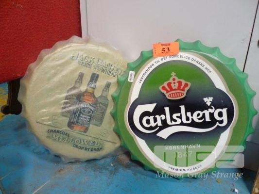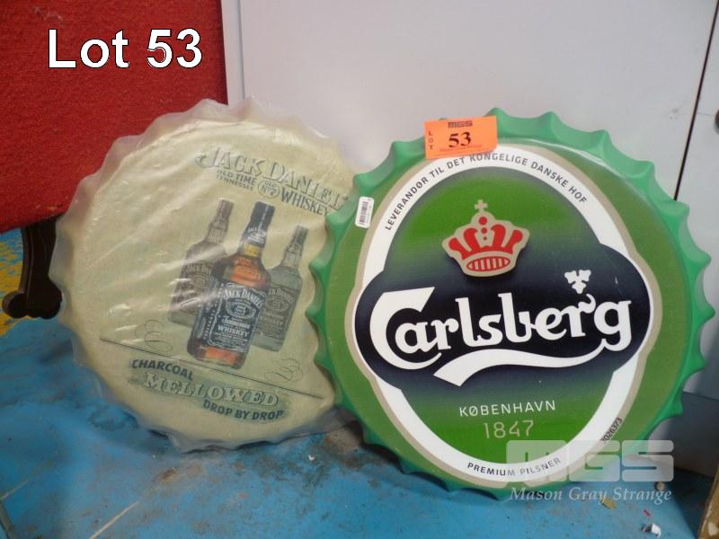 2 x REPRODUCTION TIN BOTTLE TOP SIGNS, JACK DANIELS & CARLSBERG