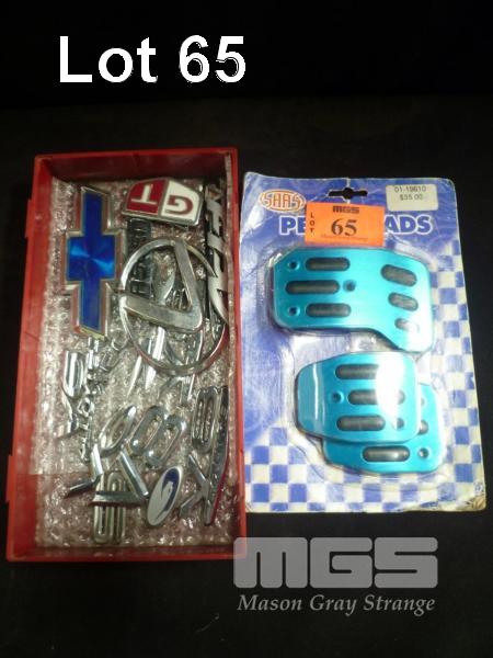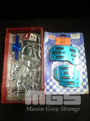 BLUE ANODISED CAR FOOT PEDALS & ASSORTED CAR BADGES