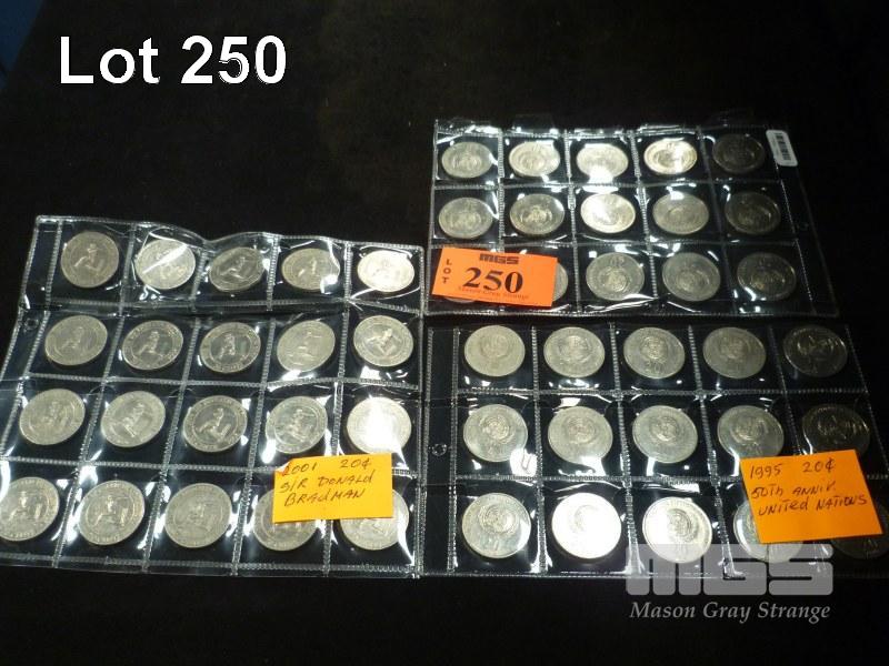 20 X AUSTRALIA 2001, 20c, COINS, 'DONALD BRADMAN' 30 X AUSTRALIA 1995, 20c, COINS, '50th ANNIVERSARY UNITED NATIONS'