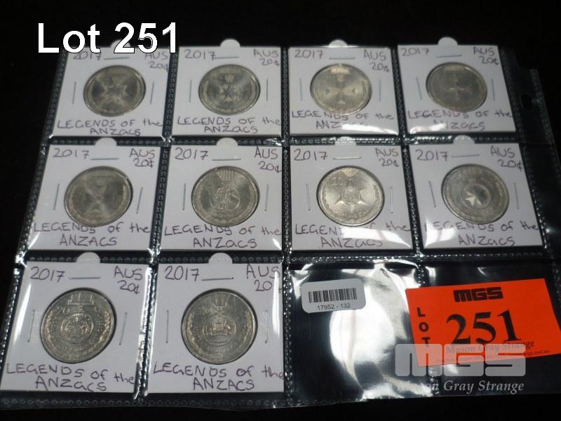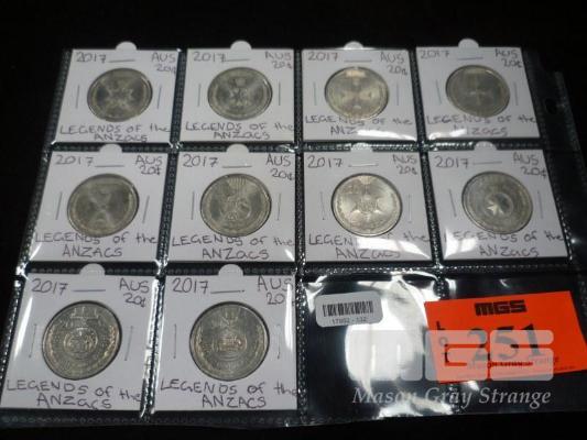 SET OF 10 X AUSTRALIA, 2017, 20c COMMEMORATIVE COINS, 'LEGENDS OF THE ANZACS'
