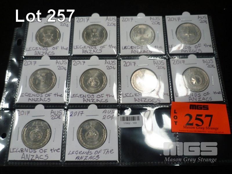 SET OF 10 X AUSTRALIA, 2017, 20c COMMEMORATIVE COINS, 'LEGENDS OF THE ANZACS'