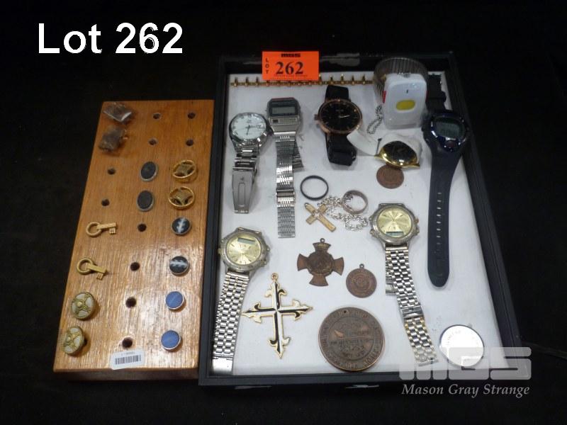 ASSORTED WRIST WATCHES, CUFF LINKS, MEDALLIONS, ETC
