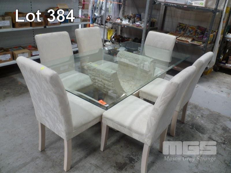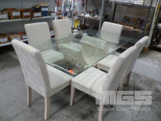 7 PIECE DINING SUITE INC RECTANGULAR TABLE, RESIN MARBLE LOOK BASE, GLASS TOP & 6 x BEIGE FABRIC DINING CHAIRS