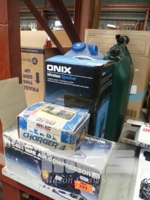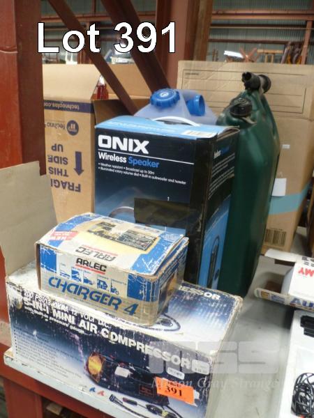 ARLEC BATTERY CHARGER, 5-IN-1 MINI AIR COMPRESSOR, ONIX WIRELESS CAMPING SPEAKER & 2 x PLASTIC WATER JERRY CANS
