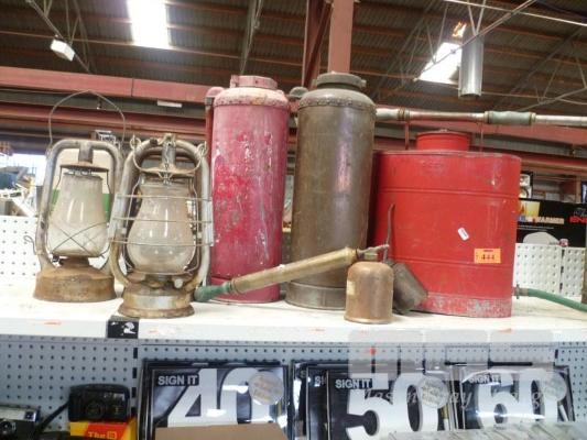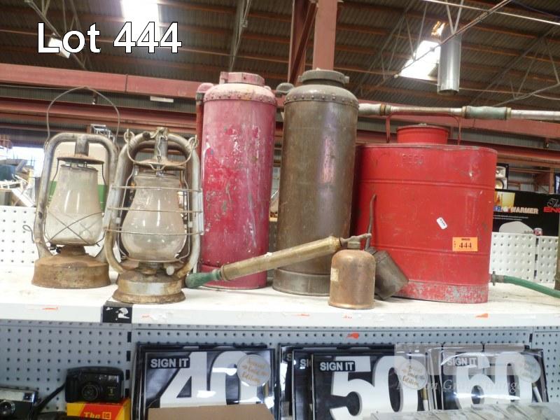 2 x VINTAGE FIRE EXTINGUISHERS, REGA, BACKPACK SPRAYER, 3 x KEROSENE LANTERNS, ETC