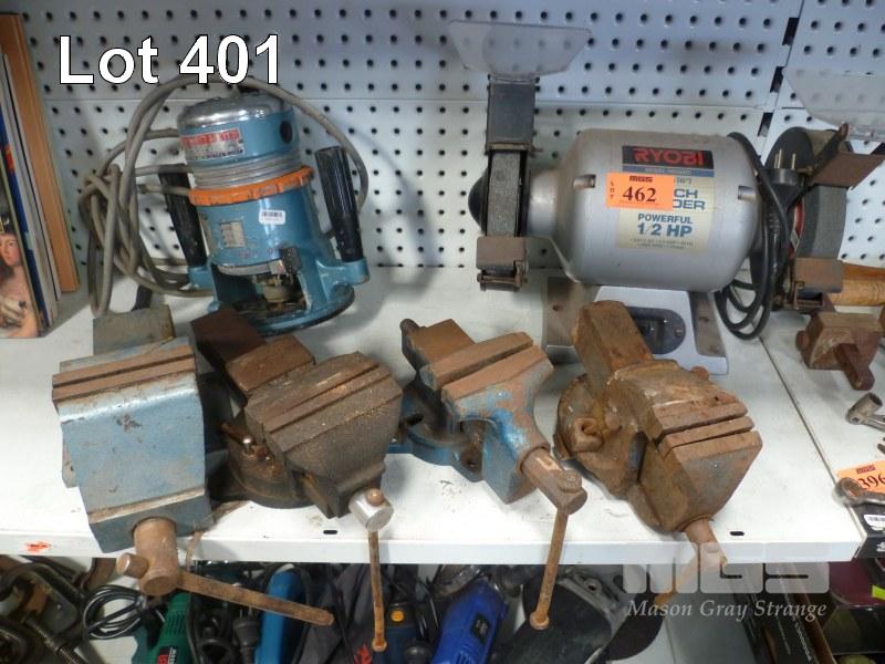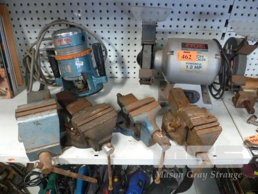 4 x BENCH VIES, RYOBI BENCH GRINDER & TOWA HEAVY DUTY ROUTER