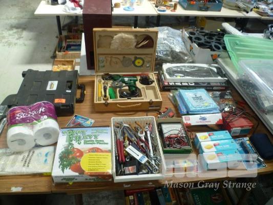 ASSORTED HAND TOOLS, BATTERY CHARGERS, MULTIMETER, SINGER DRILL SET, ETC, 1 x TABLE
