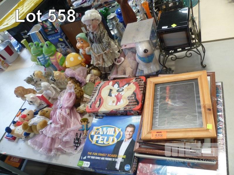 ASSORTED ORNAMENTS, DOLLS, MASUDA RETRO TV, TOYS, PRINTS, ETC