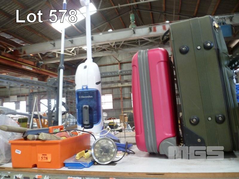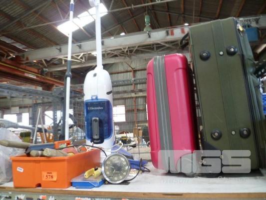 ELECTROLUX CORDLESS UPRIGHT VAC, SUITCASES, HAND TOOLS, ETC