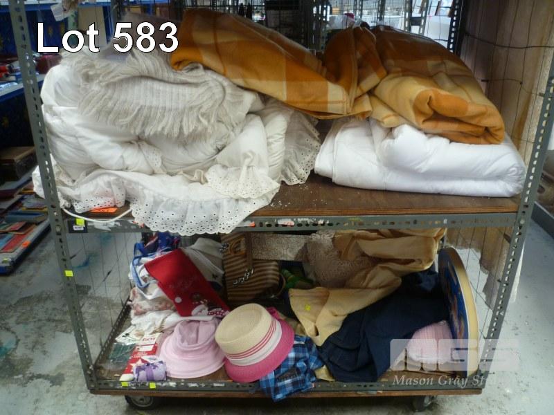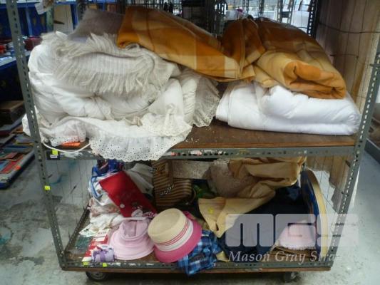 ASSORTED BEDDING, CLOTHING, ETC, 2 x BAYS