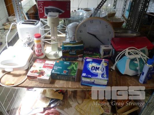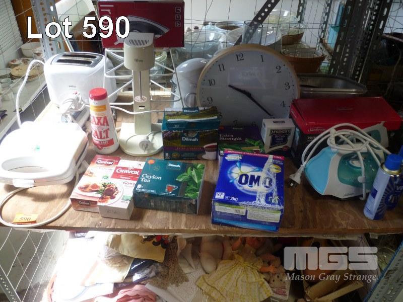 ASSORTED KITCHEN APPLIANCES, IRONS, GROCERIES, ETC