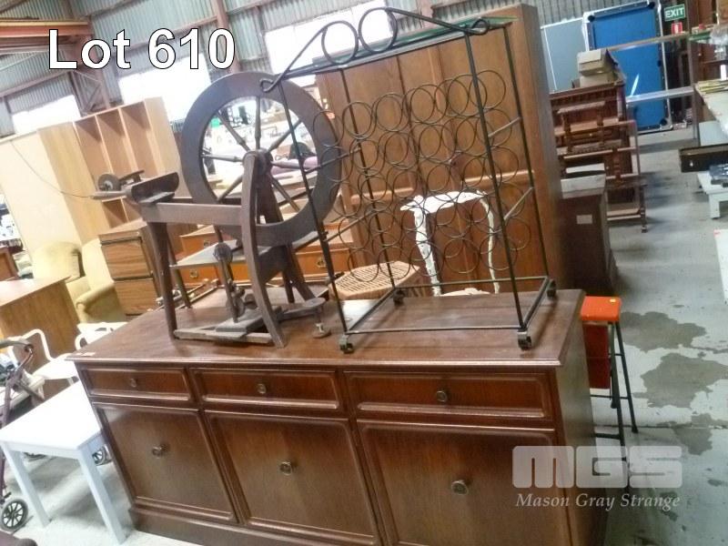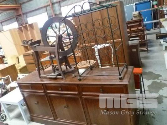 TIMBER SIDEBOARD, 3 x DRAWER/DOOR, WIRE WINE RACK, SPINNING WHEEL, ALL FAULTS & WHITE TIMBER SIDE TABLE