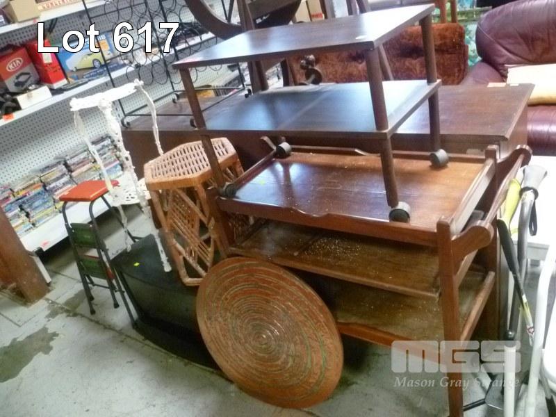 CAST IRON PLANTER STAND, STOOL, CANE SIDE TABLE, ENTERTAINMENT UNIT, COPPER WALL ART, TRAYMOBILE & MOBILE TABLE