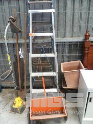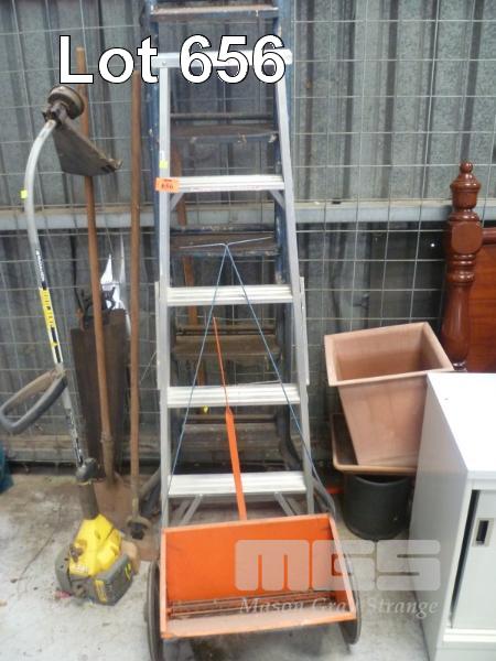 BAILEY & BLUE METAL A-FRAME LADDERS, FERTILISER SPREADER, MASPORT PETROL LINE TRIMMER & ASSORTED GARDEN TOOLS