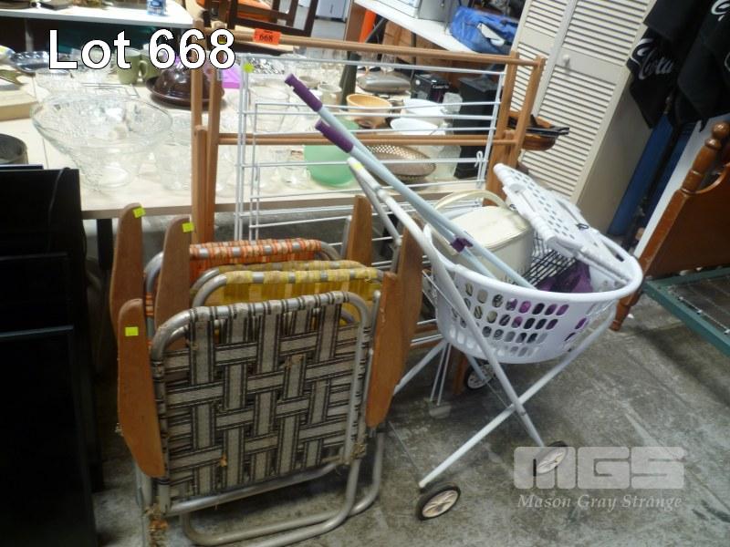 2 x CLOTHES AIRERS, LAUNDRY CART, 3 x OUTDOOR CHAIRS, ETC