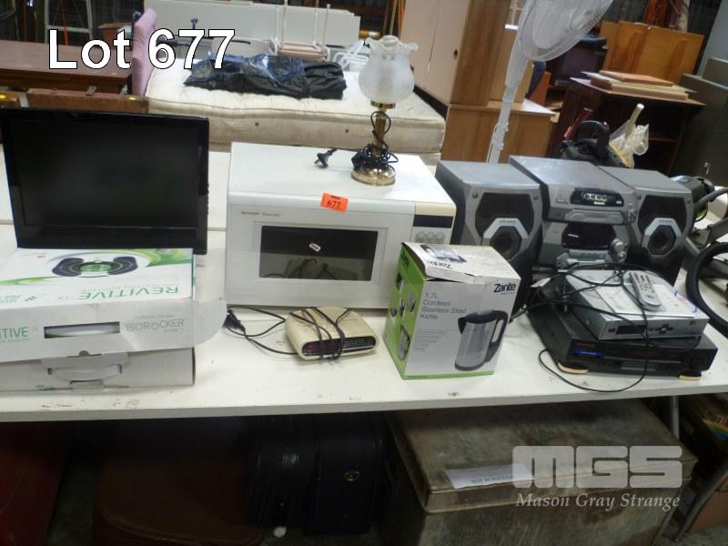 SHARP MICROWAVE, PANASONIC CD STEREO SYSTEM, REVITIVE CIRCULATION BOOSTER, HITACHI VCR, DSE LCD TV/DVD COMBO, ETC, 1 x TABLE