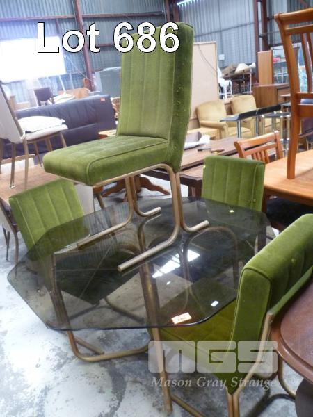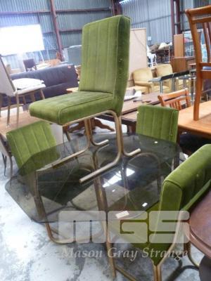 5 PIECE DINING SUITE INC METAL FRAME, GLASS TOP OCTAGONAL TABLE & 4 x GREEN VELVET CHAIRS