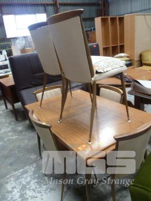 7 PIECE DINING SUITE INC METAL FRAME, TIMBER LAMINATE TOP, RECTANGULAR, EXTENSION TABLE & 6 x DINING CHAIRS, BEIGE VELVET, METAL FRAME