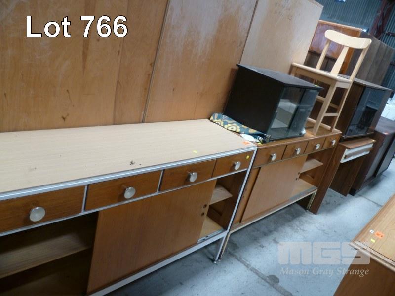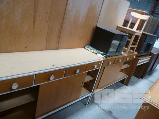 2 x RETRO METAL FRAME SIDEBOARDS, TIMBER LAMINATE STUDENTS DESK, TIMBER CHAIR & 2 x ENTERTAINMENT UNITS
