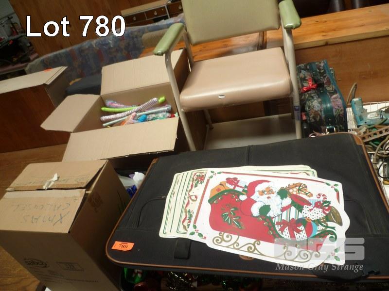 SUITCASE & CONTENTS CHRISTMAS DECORATIONS, 1 x BOX COAT HANGERS, ASSIST CHAIR, ETC, 1 x TABLE