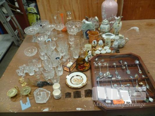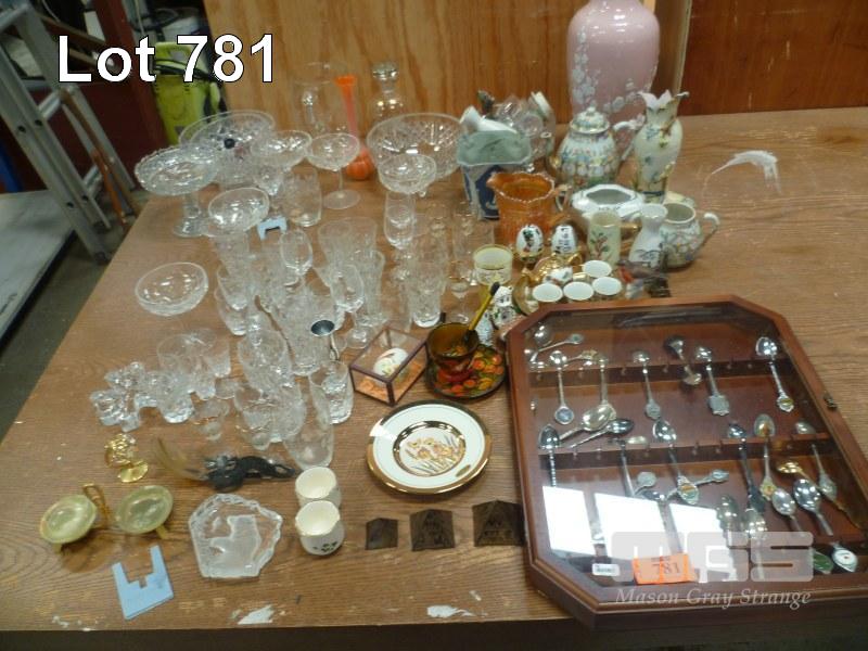 ASSORTED CRYSTAL/GLASSWARE, FINE CHINA, SOUVENIR SPOONS, ETC