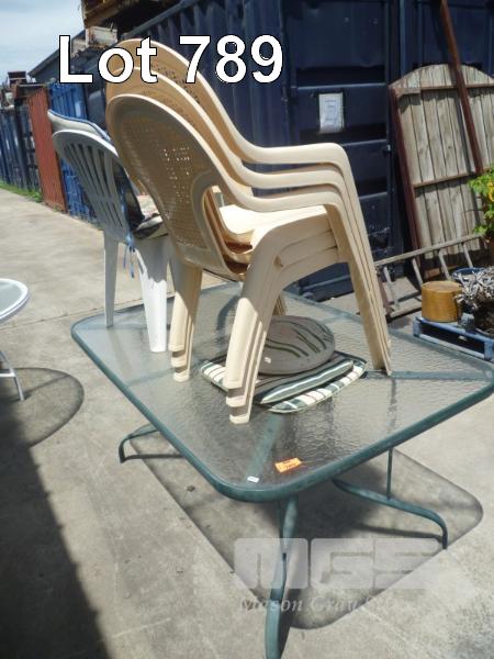 ALUMINIUM FRAME OUTDOOR TABLE, GLASS TOP WITH 4 x PLASTIC OUTDOOR CHAIRS