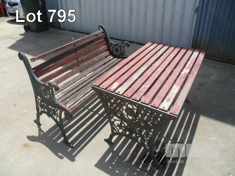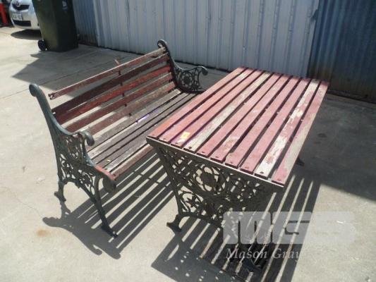 CAST IRON, TIMBER SLAT OUTDOOR TABLE & BENCH (REQUIRES REPAIR)
