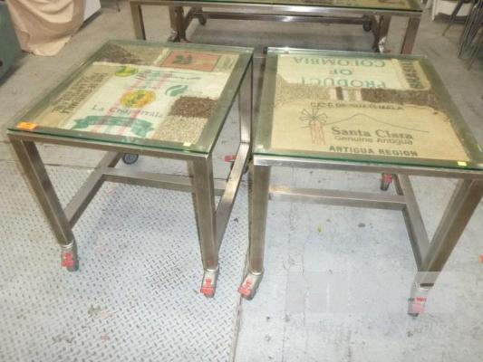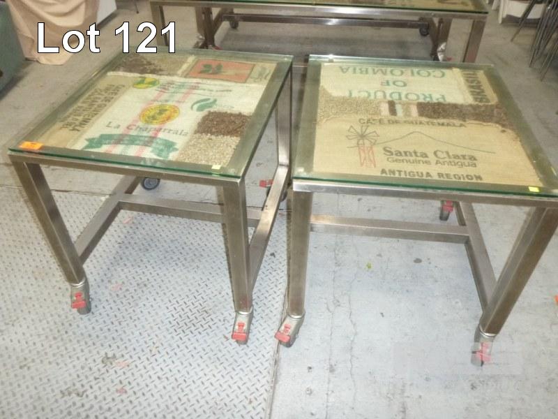 2 x MOBILE TABLES, 80 x 80cm, STAINLESS STEEL FRAME, GLASS TOP, COFFEE THEME INSERT