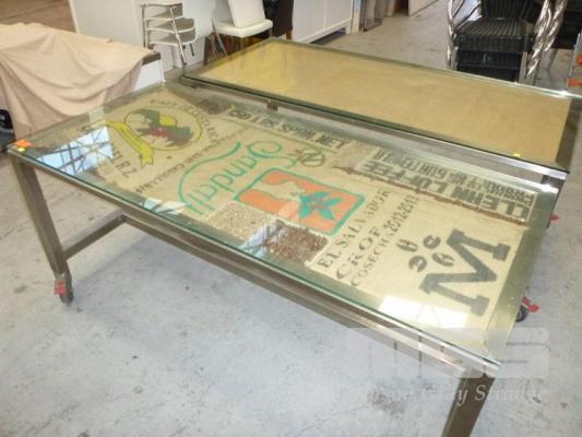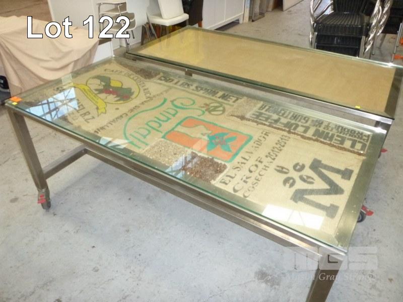 2 x MOBILE TABLES, 170 x 80cm, STAINLESS STEEL FRAME, GLASS TOP, COFFEE THEME INSERT