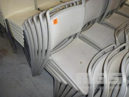 25 x OUTDOOR STACKING CHAIRS, GREY PVC, SYNTHETIC FIBRE SEAT BACK (SOME WORN)