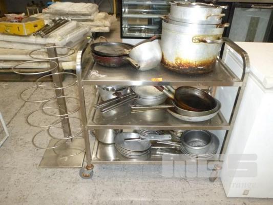 STOCK POTS, FRY PANS & 3 TIER TROLLEY