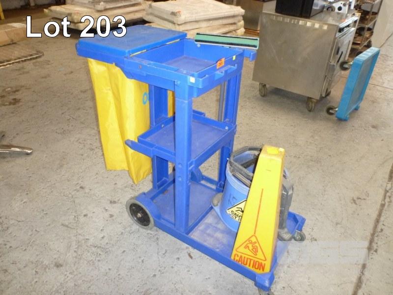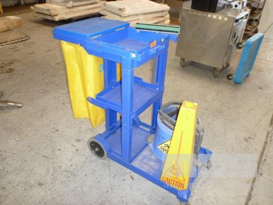 CLEANING TROLLEY/HOUSE KEEPING, OATES BLUE PLASTIC 3 TIER WITH WASTE BAG MOP BUCKET & CAUTION SIGN