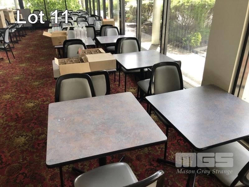 6 x SEBEL TABLES 750mm x 750mm PEDESTAL BASE) WITH 12 x MATCHING SEBEL GREY VINYL CHAIRS