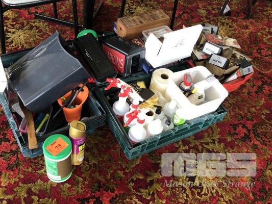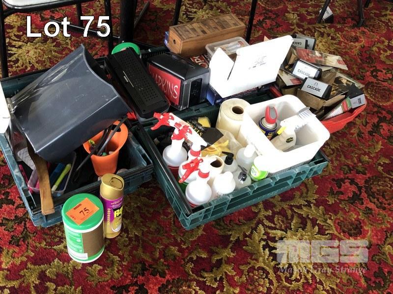 ASSORTED CLEANING PRODUCTS, SPRAY BOTTLES, TABLE NUMBER HOLDERS, STATIONARY & GAMES,ETC